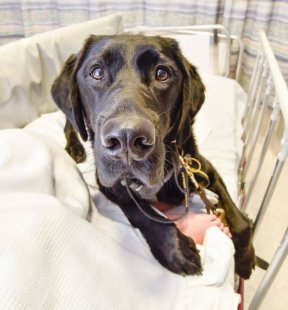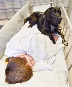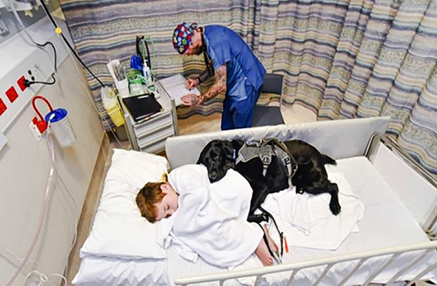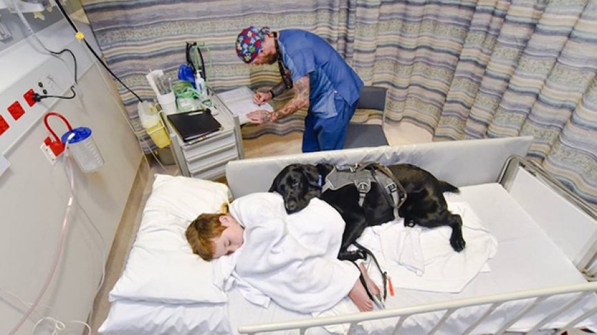 Este é Mahe, o cão que não abandona seu dono autista, um garoto de 9 anos, nem na cama do hospital