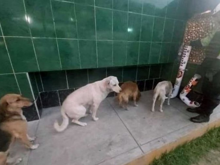 A delegacia de Monterrey, Peru, coloca comida para animais abandonados e os cães fazem fila para comer