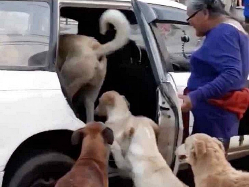 As imagens mostram uma senhora idosa que, determinada a adotar um grupo de cães de rua, chama um táxi para levá-los para casa.